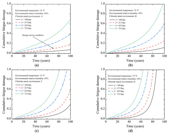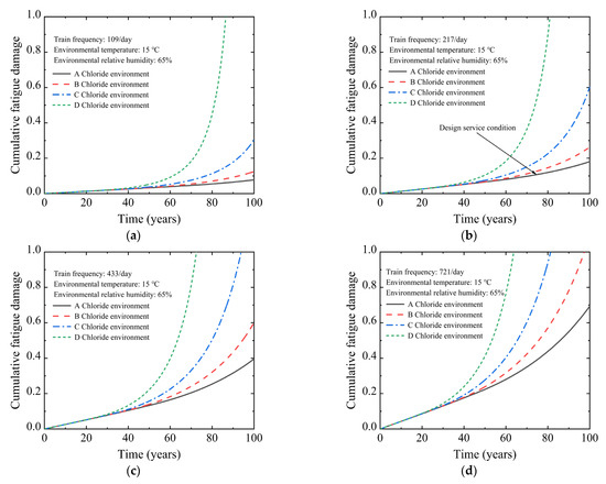 Cumulative fatigue damage of U-shaped beam under different chloride attack environments: (a) A chloride attack environment; (b) B chloride attack environment; (c) C chloride attack environment; (d) D chloride attack environment.