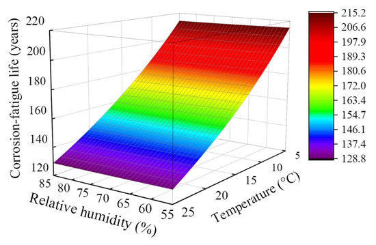 As can be seen from Figure 8, when considering the same temperature value, the change of relative humidity will hardly affect the corrosion-fatigue life, which is consistent with the existing study [22]. Unlike relative humidity, the environmental temperature has a more detrimental effect on corrosion-fatigue life. When the environmental temperature is 15 °C, the corrosion-fatigue life is 165.3–164.2 years under the relative humidity of 55–85%. When the relative humidity increases from 55% to 85%, the corrosion-fatigue life of the U-shaped beam decreases by 0.67%. When the relative humidity is 65%, the corrosion-fatigue life is 214.5–129.3 years at the environmental temperature of 5–25 °C. When the environmental temperature increases from 5 °C to 25 °C, the corrosion-fatigue life of the U-shaped beam decreases by 39.7%. Compared with the design service condition, the environmental temperature and relative humidity can reduce the corrosion-fatigue life by up to 21.5% and 0.36%. When the environmental temperature rises to 25 °C and the relative humidity rises to 85%, the corrosion-fatigue life is 128.8 years, which is decreased by 21.9% compared with the design service condition.
