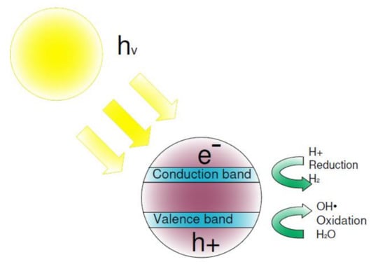 The photocatalytic reaction of TiO2 was first described by Fujishima and Honda [20] in 1972. During this reaction, irradiation of semiconductor (TiO2) with light (λ < 415 nm) causes the electrons (e−) to shift from the valence band (vb) to the conduction band (cb), leading to the formation of electron holes h+ (Equation (1), Figure 1). The resulting pairs of charges initiate a reduction–oxidation process. Oxygen and water absorbed from the air act as strong oxidants with the potential to decompose a wide range of compounds (Equations (2) and (3)) [21].