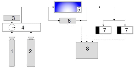 A schematic diagram of the test setup is presented in Figure 2. All parameters, including test time set, flow rate, and concentration of specific gases, were controlled by CGM200 software (MCZ Umwelttechnik, Bad Nauheim, Germany). The set pollutant mixture was provided from the zero air gas generator model Zero Gas Supply NGA 19S (MCZ Umwelttechnik, Bad Nauheim, Germany) and NO from the gas cylinder (Air Liquide, Paris, France), while O3 was generated with the ozone generator model Referenz Photometer (MCZ Umwelttechnik, Bad Nauheim, Germany). The specific proportions of pollutants were set in the mass flow controller model CGM 2000 (MCZ Umwelttechnik, Bad Nauheim, Germany). The final gas pollutant was provided to the reactor cell. Then, NOx was measured with NOx analyzer Model T400 (TELEDYNE API, San Diego, CA, USA) and O3 with ozone analyzer Model T200 (TELEDYNE API San Diego, CA, USA). The results were collected in data logger model DAS DM370 (DAC SYSTEM, Gdansk, Poland).