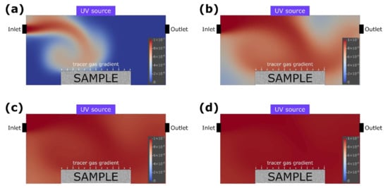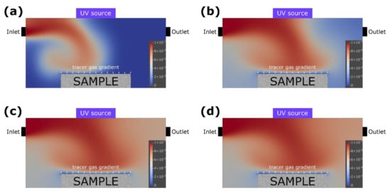 The relative concentration of the tracer gas in the reactor having a photocatalytic sample at the bottom presented on a two-dimensional cross section of the computational domain in the axes of the inlet and outlet at specific time steps: (a) 10 s, (b) 1 min, (c) 3 min, and (d) 10 min.