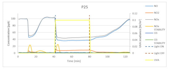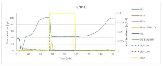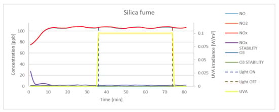 The study assumed the average sample exposure time as minimum 30 min and achieving an NOx concentration stability of <0.5. Stability factor is expressed by the standard deviation value of the last 25 records (every 10 s). Before exposure to UVA light, the samples were kept in the dark for approximately 30 min. Preliminary test indicated that strictly dark conditions should be maintained, as the K7000 photocatalyst is activated by visible light. Even small dosages of light could activate the photocatalytic reaction, and the assumed gas concentration (100 ppb) could not be achieved. The experimental results obtained for P25, K7050, and K7000 samples and silica fume are presented in Figure 5, Figure 6, Figure 7 and Figure 8. The results indicated a significant reduction in the concentration of NO by photocatalytic powders (K7050—58.42%, K7000—62.79%, P25—65.71%) and negligible reduction by silica fume.