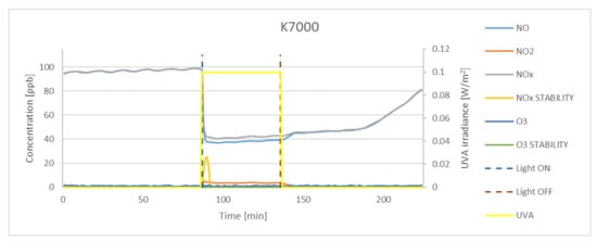 The oxidation of NO in the photocatalytic reaction with concentrations of NO2, NOx, and O3 measured for K7000. Data on UVA irradiation are shown in the supplementary chart. Dashed lines indicate the time of light on and off.