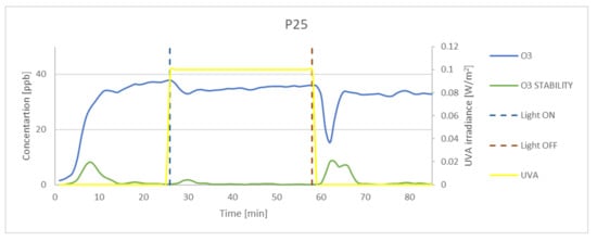 The oxidation of O3 in the photocatalytic reaction with concentrations measured for P25. Data on UVA irradiation are shown in the supplementary chart. Dashed lines indicate the time of light on and off.