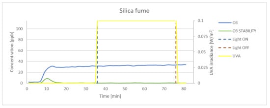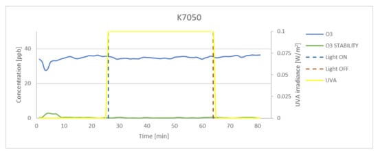 Although numerous preliminary tests were conducted, the concentration achieved in the chamber was lower than that set at the inlet. The measured concentration of ozone in dark conditions for 100 ppb at the inlet was on average 65 ppb. The experimental results obtained for P25, K7050, and K7000 samples and silica fume are presented in Figure 9, Figure 10, Figure 11 and Figure 12. The results indicated that the reduction of ozone concentration (K7050—6.45%, K7000—4.85%, P25—0.87%) was much lower than in the case of nitrogen oxides. No evident oxidation of ozone concentration was observed for silica fume. Despite a lower level of reduction, similar to NOx, the process of oxidation began immediately after UVA irradiation.