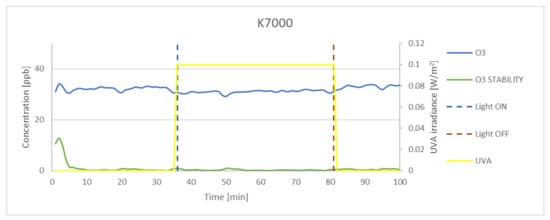 The oxidation of O3 in the photocatalytic reaction with concentrations measured for K7000. Data on UVA irradiation are shown in the supplementary chart. Dashed lines indicate the time of light on and off.
