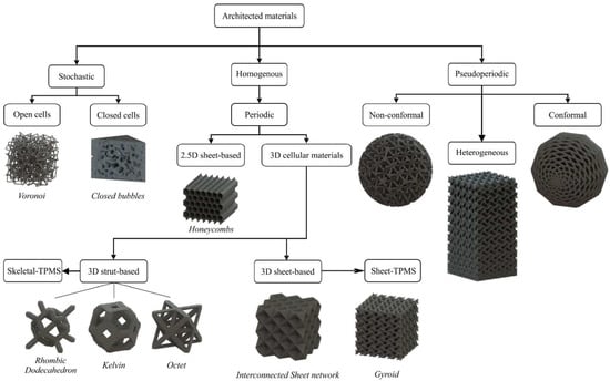 There is a vast number of architected materials with different geometries, thus it is necessary to classify them into categories based on their basic topological characteristics, as is shown in Figure 1. The first criterion is the periodicity of the structure, hence three families of structures are derived from this: the stochastic, the periodic, and the pseudo-periodic [30].