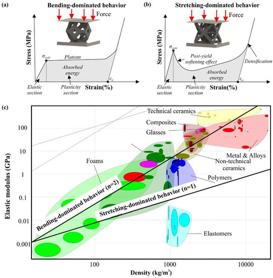 Indicative mechanical response for a structure with: (a) stretching-dominated behavior (Octet); (b) bending-dominated behavior (Kelvin); (c) Material property chart coupled with the curve for the two examined mechanical behaviors.