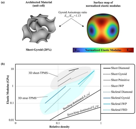 (a) Indicative surface map of the normalized local elastic modulus for a Gyroid structure coupled with a value of the Emax/Emin ratio, (b) Effective elastic modulus and the mechanical behaviors of several TPMS architected materials constructed with metal additive manufacturing [20,62,63,64,65,66].