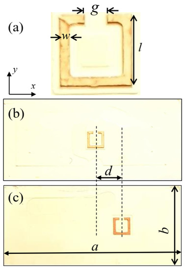 A schematic layout of the split-ring resonator with its geometrical dimensions is shown in Figure 1a. In order for the structure to operate in the C-band, i.e., the resonance frequency between 4 GHz and 8 GHz, the dimensions of the resonator were as follows: side length l = 3.3 mm, width w = 0.6 mm, and gap g = 1 mm. A Rogers TMM10 substrate with a dielectric constant of er = 9.2 was used to fabricate the designed structures with a thickness of 1.27 mm using LPKF prototyping system ProtoMat S63.