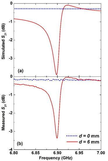 Figure 2a,b show the simulated and measured transmission amplitude, respectively. More specifically, it shows the results for the completely symmetric configuration with respect to the excitation when the asymmetric distance d = 0 mm, as depicted in Figure 1b with dotted blue lines. Meanwhile, the results of the asymmetric configuration when the asymmetric distance d = 6 mm that is depicted in Figure 1c are shown in Figure 2 as solid red lines.