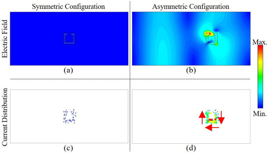 (a,b) Spatial electric field distribution at the surface of the designed SRR structures at 6.9 GHz for the symmetric and asymmetric configurations, respectively; (c,d) current distribution at 6.9 GHz for the same configurations. The red arrows were added to visualize the direction of the current.