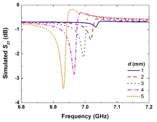 Next, a series of simulations was carried out by moving the SRR from the center of the rectangular waveguide to the right with different asymmetric distances (d), i.e., from 1 mm to 5 mm, with a step of 1 mm, as demonstrated in Figure 5.