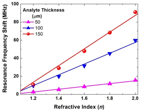 Resonance frequency shift in MHz versus the refractive index (n) of the overlayer analyte with different thicknesses between 50 and 150 μm.
