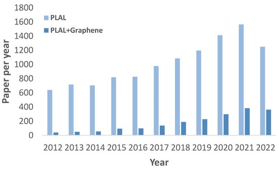 In comparisons to other nanostructure fabrication methods, PLAL is regarded as a straightforward method that is easy and fast. Moreover, PLAL is regarded as a green and environmentally friendly method as it does not require the use of toxic chemicals. The simple experimental setup for this method is also an attractive feature, as it does not require any expensive vacuum chambers, clean rooms, or complicated procedures. It is worth noting that PLAL is termed differently by many researchers; however, they indicate the same technique. Some of these terms are pulsed laser-induced reactive quenching (PLIRQ), laser ablation in a liquid medium (LALM) [29], laser ablation of solids in solution (LASiS) [37], and liquid phase pulsed laser fragmentation (LP-PLF) [38]. PLAL have gained high interest in the past decade for the formation of various nanostructures in general and for graphene-based nanostructures specifically as illustrated in Figure 1.