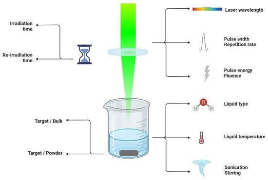 One of the great advantages of the PLAL technique is the ability to combine different target materials and liquids in an unlimited combination to produce diverse nanostructures in liquids of choice as can be seen in Section 3. Another advantage of PLAL is the ability to control the size, shape, size distribution, and structure of the produced nanostructures through the choice of laser parameters used during the ablation [37,39]. These parameters include the laser wavelength, pulse width, pulse repetition rate, pulse energy, and fluence (energy per unit area) [37]. Moreover, the irradiation time during ablation, or the re-irradiation after its completion, is a key factor affecting the size of the produced nanostructures [40]. These factors are illustrated in Figure 2.