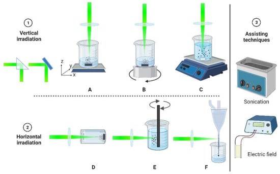 There are various designs to conduct a PLAL experiment. The most common is the vertical configuration where the laser beam irradiates the target vertically, where the laser beam can be redirected using a prism or mirror. The target is placed at the bottom of a container that is filled with a liquid. The container is placed on top of an XYZ translation stage (Figure 3A) or a rotational stage (Figure 3B) to assist in the movement of the target under laser irradiation to avoid crating. When the target is a powder, a magnetic stirrer is used to distribute the particles under the laser beam (Figure 3C). Furthermore, the laser can be unfocused or focused with the aid of a lens. The second group of configurations is the horizontal setup. In this formation, a target could be fixed to the bottom of cuvette that is filled with a liquid and sealed (Figure 3D). The cuvette is then fixed on an XYZ translation stage, and the laser beam irradiates the target horizontally [34]. The advantage of this setup is that it assists in focusing the laser beam on the target surface. Moreover, since the liquid is sealed, there will be no evaporation in the liquid and therefore the focusing conditions do not change as in the vertical irradiation, for which the container is open and the beam might become out of focus with the change in the liquid level. If the target is rod-shaped, then it can be made to rotate around its axis while being dipped in the liquid during the laser exposure, and the laser beam irradiates it horizontally (Figure 3E) [41]. Lastly, the free liquid jet configuration (Figure 3F) has an advantage in its ability to precisely correlate the laser energy and material responses; however, it is rarely used [42,43]. All configurations can be extended by incorporating external methods, such as including sonication or a uniform electric field.