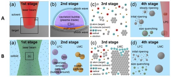 Laser–matter interaction stages for (A) laser synthesis of colloids (LSC): (a) laser irradiation of target, (b) material ablation and the formation of plasma, cavitation bubble and shock wave, (c) nanostructure formation, and (d) ripening, quenching and re-irradiation of nanostructures. (B) laser processing of colloids (LPC): (a) laser irradiation of colloidal particles, (b) material phase changes, (c) particles formation, and (d) ripening and quenching of produced particles [45].