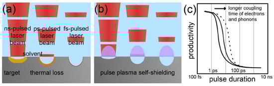 The effect of pulse duration on the laser ablation of a target in liquid (a) thermal loss, (b) pulse plasma self-shielding, and (c) NP productivity vs. pulse duration. [45].
