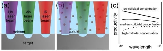 Effect of laser wavelength on the ablation rate in the (a) absence and (b) presence of colloidal particles, and (c) NPs productivity vs. wavelength at different colloidal concentrations [45].