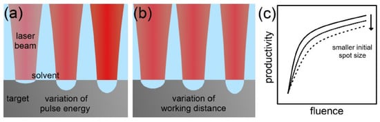 Effect of laser fluence on the ablation rate due to (a) pulse energy and (b) working distance. (c) Productivity of NPs vs. fluence by different initial spot sizes [45].