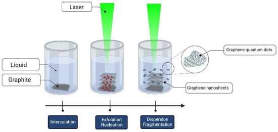 Among the physical methods used to produce graphene from graphite is pulsed laser ablation. Laser ablation (LA) can occur in vacuum, argon, or air [19]. However, there are many advantages when performed in liquids via the one-step pulsed laser ablation in liquid technique (PLAL) [28,29,30]. This method is used to produce graphene through laser irradiation of a graphite target submerged in a liquid medium. The laser–target interaction within the liquid medium provides the high temperature and pressure needed for nanostructure fabrication. Through this one-step method, it was possible to exfoliate graphene in a liquid medium, cause nucleation for graphene quantum dots synthesis, or directly deposit graphene on a foil [31,32]. Not only was this method successful in the production of carbon nanostructures, but it has shown to be effective in the synthesis of metal and metal-oxide nanostructures [33,34,35,36]. The factors controlling the production of nanostructures via PLAL are of interest to many researchers [36,37].