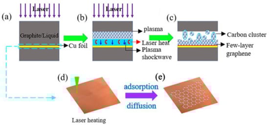 Mechanism of film deposition by PLAL. (a) Schematic diagram of laser irradiation of graphite suspension in liquid, (b) plasma and shockwave formation, (c) production of FLG on Cu substrate, (d) fabrication of graphene on Cu substrate, and (e) final product after adsorption and diffusion [32].