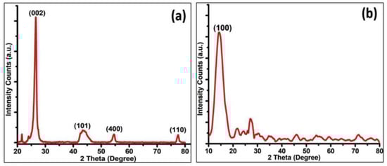X-ray diffraction (XRD) is an analytical technique that is used in the identification of crystalline materials and provides knowledge of their phase. Furthermore, it can give information on the material’s unit cell dimensions. Graphene is identified by five major peaks in an XRD spectrum. These peaks occur at 26.5°, 42.3°, 44.5°, 54.6°, and 77.4°, which are related, respectively, to the hexagonal planes (002), (100), (101), (004), and (110) of graphitic carbon [63] (Figure 10a). The XRD spectrum for graphene oxide is characterized by a peak positioned at 2θ ≅ 9–11°, which corresponds to the (001) plane. This peak has been reported to shift to 2θ ≅ 12–17° (Figure 10B) depending on the amount of water trapped between adjacent layers of graphene [16,24]. As for the GQDs and GOQDs, it has been reported that they exhibit different structures, such as those of amorphous carbon, diamond-like crystal structure, and graphite or graphite oxide structures [13].