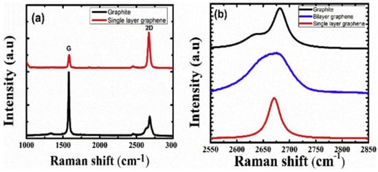 (a) Raman spectra for graphite and single-layer graphene and (b) 2D band enlarged. Reprinted with permission from Ref. [66]. 2020, Elsevier.