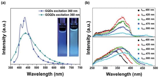 (a) PL spectra of GQDs and GOQDs and (b) their excitation dependency [68].