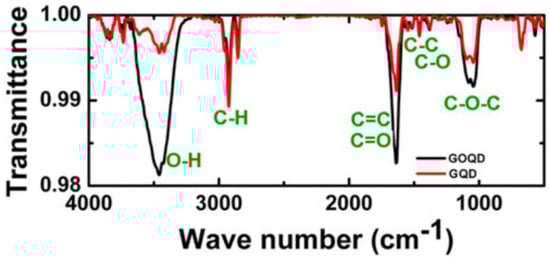 FT-IR spectrum of GQDs (red) and GOQDs (black). Reprinted with permission from Ref. [69]. 2014, IOP Publishing.