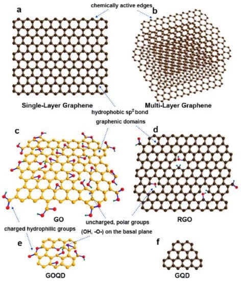 Graphene nanostructures: (a) single-layer graphene, (b) multi-layer graphene, (c) graphene-oxide, (d) reduced graphene-oxide, (e) graphene-oxide quantum dots, and (f) graphene quantum dots. Reprinted with permission from Ref. [71]. 2017, American Chemical Society.