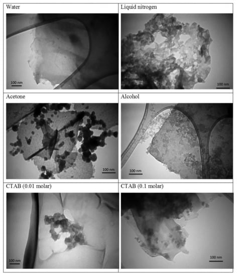 Graphene nanosheets were also produced using PLAL with liquid media other than water. In order to investigate the effectiveness of water against other liquids as an ablation medium, liquid nitrogen, acetone, alcohol, and (0.01 M and 0.1 M) of cetyl trimethylammonium bromide (CTAB) were used [84,85]. By immersing a graphite plate in the different liquid media and keeping all experimental parameters fixed, the effect of different liquid mediums was investigated. A 7 ns laser pulse with 5 Hz repetition rate of the fundamental 1064 nm wavelength of an Nd:YAG laser was focused on the graphite plate with a fluence of 1.5 J/cm2, and 5000 laser pulses were shot on the target. In each sample, graphene nanosheets and carbon nanoparticles were found but with different percentages. Where CTAB contained the least amount of graphene sheets, this amount increased in alcohol, acetone, and liquid nitrogen, and was the highest in water (Figure 17). However, in liquid nitrogen, the graphene nanosheets had few layers when compared with those obtained from water. Moreover, in acetone, the size of the nanosheets was the greatest. This was concluded from the analysis of SPR peak, Raman spectroscopy, and TEM images. The liquid medium used in the ablation process affected the pressure on the generated plasma plume. The pressure, in turn, affected the structure, size, and morphology of the produced nanostructures. Another point that needs to be considered regarding the liquid used is the size of the liquid molecules. For example, in graphite, the spacing between the planes is on the order of the size of the water molecules, making water more effective in penetrating the graphite planes and separating the graphene sheets [84,85].