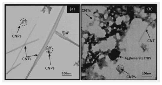 In PLAL, the energy transferred from the laser to the material is used to perform different processes. Part of the energy is consumed in melting, evaporating, and ionizing the target material to form the nanoparticles. The other part of the energy can be used to break the Van der Waals bonds [57]. The synthesis of nanoparticles via PLAL is typically a bottom-up approach. That is, after melting, evaporation, and ionization, atoms nucleate to form the nanoparticles. However, PLAL can perform laser exfoliation (LE), which is regarded as a top-down approach. When a laser is used to irradiate a graphite target, both bottom-up and top-down process can occur. Single carbon atoms can be detached and then aggregate to form carbon nanoparticles. Moreover, the laser–carbon interaction in the liquid media can thermalize the system, preventing the carbon from reaching the melting temperature. In this case, a single or multi-layer of graphene can be exfoliated when the Van der Waals bonds are broken [58]. Both carbon nanoparticles and graphene nanosheets will be dispersed in the colloidal solution (Figure 8) [58]. An extensive review on liquid-phase exfoliation (LPE) for the formation of graphene nanosheets (GNS) from graphite precursors in liquid media has been undertaken [31,59,60,61].