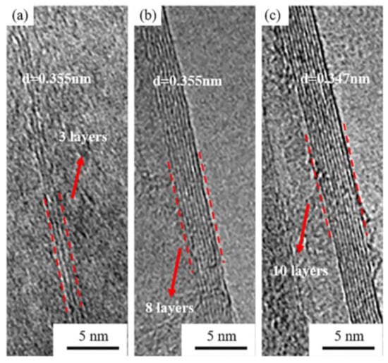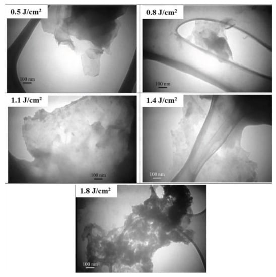 At room temperature, graphene has been formed by irradiating a graphite target with a 532 nm Nd:YAG laser when the target was submerged in distilled water [76]. The repetition rate of the laser pulses was 10 Hz with a pulse width of 6 ns. When investigating the effect of laser fluence on the produced nanostructures, it was found that lowering the fluence to 0.4 J/cm2 resulted in the production of more graphene and less of other carbon nanostructures. Moreover, the study did not report the observation of graphene oxide; however, there was an indication of the presence of a small amount of oxygen trapped between graphene layers. The graphene layers were of multilayer thickness and were not stacked in an orderly fashion, as indicated by the broad peak of the XRD analysis [76].