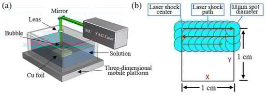 PLAL has also been used to directly deposit layers of graphene on the surface of a foil [32]. Figure 9 illustrates the process of the deposition. The mechanism of graphene growth on a Cu foil was described [32]. Starting from the law of conservation of energy, the total energy is the summation of the energy reflected, absorbed, and transmitted. Graphite flakes are uniformly suspended in water. Since the absorptivity of graphite is very large, little to none of the laser energy is transmitted to the substrate. The water performs two roles in the process. First, the water acts as an absorbing layer. Second, it acts as a constraining layer. The photothermal process takes place on the interface between the graphite and water. The laser irradiation falling on the material in the water causes small fragmentation of graphene sheets and the ejection of carbon atoms and ions. Furthermore, it causes the ejection of free hydrogen radicals and oxygen ions. This is followed by the formation of dense gas plasma plumes. The expansion of the plasma plume give rise to a high-pressure shock front that reacts physically and chemically with the surrounding liquid environment. The shock front eventually collapses, causing the formation of bubbles. The bubbles expand outwardly at high speed, giving rise to a pressure difference on the sides. As the bubbles contain carbon atoms, carbon ions, and carbon clusters, at the interface with the foil, they exhibit a high-pressure front and the bubbles get deformed and depressed at the interface. This in turn causes a microjet toward the substrate. After cooling, graphene layers are formed on the surface of the Cu foil [32].