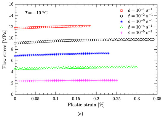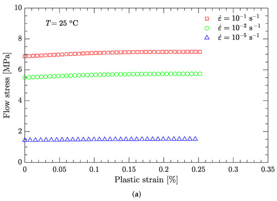 Figure 17 compares several values of at high strain rates based on the flow stress vs. plastic strain curves. The maximum of is only , which is negligibly small. Therefore, in this study, the sample temperature (T) is assumed to be constant and equal to the ambient temperature ().