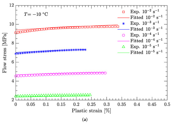 where the melting temperature () of the DNAN-based melt-cast explosive is . The reference temperature was previously specified (). At the reference strain rate () and under a certain plastic strain, there are four flow stress–strain rate curves (Figure 5, Figure 6, Figure 7 and Figure 8). Therefore, parameter m can be fitted in the same way as parameter C (Figure 9c). The value of m was determined to be 0.815.
