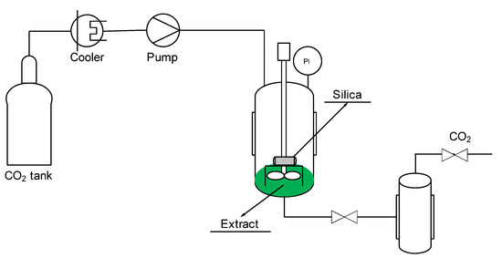 An SSI pilot plant (Thar Technologies), the scheme of which is shown in Figure 1, was used for the impregnation of antioxidant compounds of mango leaves into silica. The plant included a CO2 bottle, a chiller to cool the CO2 and keep the fluid in a liquid state prior to entering the high-pressure pump for CO2 and a heat exchanger to heat the CO2 before introducing it into an impregnation cell of high pressure. In this cell, 5 mL of ethanolic extract and a porous metal basket of 10 µm, in which 200 mg of silica was contained, were introduced. Batch impregnation process was performed for the time established in each experimentation, and there was no direct contact between the extract and the porous silica.