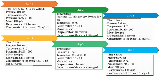 The effects of five independent variables, pressure (100–350 bar), temperature (35–50 °C), time of impregnation (6–22 h), ethanolic extract concentration (20–80 mg/mL) and type of silica, on the impregnation process were evaluated while amount of silica (200 mg), volume of extract (5 Ml), stirring rate (400 rpm) and depressurization rate (90 bar/min) were kept constant throughout the process. These levels of variables were selected according to the experience [12] and limitation of the equipment and the degradability of the extract. A summary of the experiments carried out is detailed in Table 1. Moreover, the step order and sequence of these experiments are indicated in Figure 2.