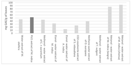 Regarding the content of total phenols, the amount that was obtained in the present investigation, 279.53 ± 3.27 mg GAE/g extract, was higher than that of leaves extracts obtained from Moringa oleifera [31], citrus × aurantium [32], Azadirachta indica [33], Stevia rebaudiana [34], Olea europaea [35], Tanacetum vulgare [28] and Manguifera indica [30,36], as shown in Figure 3.