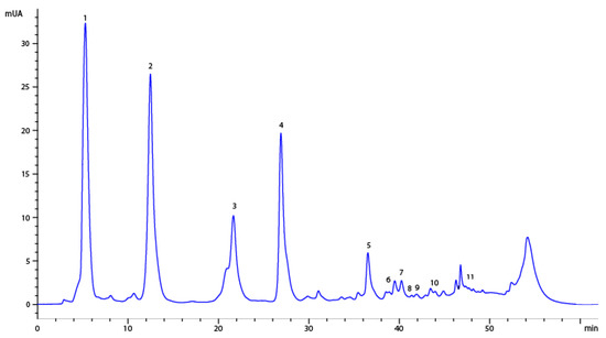 HPLC chromatogram of the extract of mango leaves. Peaks: 1, gallic acid; 2, iriflophenone 3-C-β-D-glucoside; 3, iriflophenone 3-C-(2- O-p-hydroxybenzoyl)- β -D-glucoside; 4, mangiferin; 5, iriflophenone-3-C-(2-O-galloryl)-b-D-glucoside; 6, quercetin 3-D-galactoside; 7, quercetin 3- β -D-glucoside; 8, quercetin-3-O-xyloside; 9, quercetin-3-O-β-L arabinopyranoside; 10, 1,2,3,4,6-penta-O-galloryl-β-D-glucose; 11, quercetin.