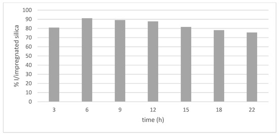 From the obtained results, it can be observed that, when increasing the impregnation time from 3 to 6 h, there was an increase of approximately 11% in the impregnation percentage; however, after 22 h of the process, there was a decrease of approximately 15% in the impregnation percentage. García-Casas et al. [14] spent 2 h impregnating quercetin into mesoporous silica beads SB-300, while Bouledjouidja et al. [16] determined that 4 h was the effective length of time for impregnating compounds, such as vitamin E, into OMS-7 porous silica.