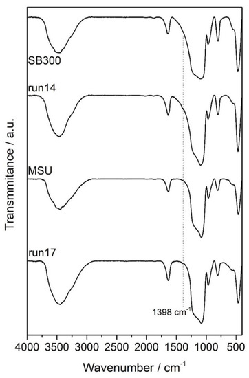 The IR patterns of the MSU and SB-300 silicas before and after mango leaves impregnation were assessed in order to identify the main functional groups contained in the samples and their possible interactions (Figure 7). The wide, broad band in the region between 3700 and 3200 cm−1 belonged to the stretching of the surface silanol groups of O–H bonds, together with stretching bands of hydrogen-bonded water molecules. The strong peak around 1090–1010 cm−1 was the asymmetrical stretching vibrations band of siloxane, –Si–O–Si–. The symmetrical stretching vibration of –Si–O–Si– was around 800 cm−1, and its bending mode appeared around 480 cm−1. A low band at 990–945 cm−1 was referred to the Si–O bond stretching of the silanol group. The deformational vibrations of physiosorbed water molecules were reflected by a peak around 1650–1600 cm−1 [41]. Iriflophenone, gallic acid and mangiferin were the main identified compounds in the impregnated silica. Thus, the carbonyl groups present in these compounds interacted with the silanol groups or with the molecules of water adsorbed on the silica. In any case, the carbonyl stretching band did not appear in the spectra due to the low levels of impregnation. A peak at 1398 cm−1, corresponding to the stretching of C–H, was the only indication of the deposition of polyphenols onto both silicas.