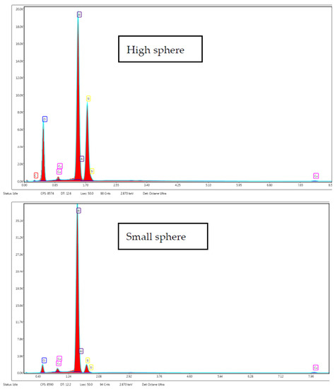 Additionally, in the particle size distribution graphs it can be observed that the particles were homogeneous; however, in the impregnated silica, there was a higher frequency of particles from 0.1 to 0.5 µm. In this regard, energy-dispersive X-ray spectroscopy was carried out to obtain the relationship between composition and the size of spheres (Figure 9). Carbon present in polyphenols was the only element that could be discerned between the polyphenols and silica. Analyses were carried out directly on the aluminum support without carbon film to avoid carbon interferences. In both samples, a prominent aluminum peak from support was precisely shown. However, contrary to expectations, it was observed that smaller spheres did not present carbon in their composition, but carbon was found when higher spheres were analyzed. Thus, impregnated compounds were deposited on the pore surface of the silica spheres. In this sense, the carbon peak in the spectrum was not so high due to the silica but exhibited a higher proportion than impregnated compounds. Moreover, the TEM images (Figure 10) did not indicate a clear difference between silica alone and impregnated silica, but it seems that antioxidant compounds were adsorbed on the matrix due to the pore size and specific surface area of the matrix. The difference between the particles was not so evident, but the texture of the impregnated sample appeared to be coarser.