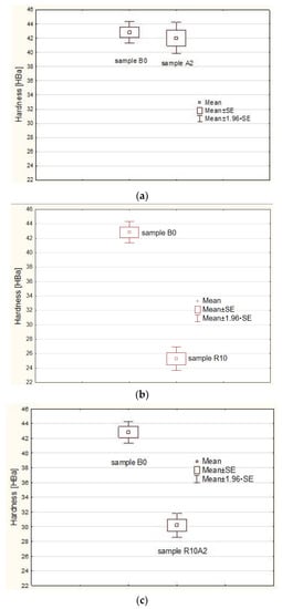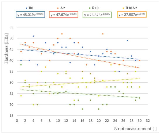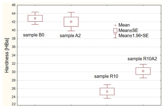 The obtained p-values of pairwise comparisons and multiple ANOVA comparisons showed that only samples B0 and A2 did not differ statistically significantly (calculated p = 0.5258 and p = 0.9404 is greater than the assumed pv = 0.05). There are significant statistical differences between the remaining samples. This allows the conclusion that the addition of aluminum to the standard sample B0 does not significantly change its hardness. The samples B0, 43 HBa, and A2, 42 HBa, are characterized by the highest hardness. The addition of 2% gamma aluminum nanopowder to the R10 sample significantly increased its hardness. The R10 sample is the most anisotropic, as evidenced by the highest value of the coefficient of variation Vs = 18.013. Sample B0 is the least anisotropic, as evidenced by the lowest value of the coefficient of variation Vs = 9.618. The A2 and R10A2 samples have the same anisotropy, as evidenced by the almost same value of the coefficient of variation Vs = 14.751 and Vs = 14.920.