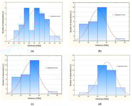 Histogram hardness HBa for: (a) sample B0, Shapiro–Wilk W = 0.97431, p = 0.66237, x ≤ class boundary; (b) sample A2, Shapiro–Wilk W = 0.96963, p = 0.52897, x ≤ class boundary; (c) sample R10, Shapiro–Wilk W = 0.93655, p = 0.07345, x ≤ class boundary; (d) sample R10A2, Shapiro–Wilk W = 0.96540, p = 0.42213, x ≤ class boundary.