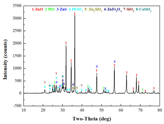 The XRD patterns show that most zinc exists as ZnO, Zn2SiO4, ZnS, and ZnFe2O4, and that most lead exists as PbS and PbSO4. In addition, there are large amounts of gangues in zinc oxide dust, especially SiO2 and CaSiO3.