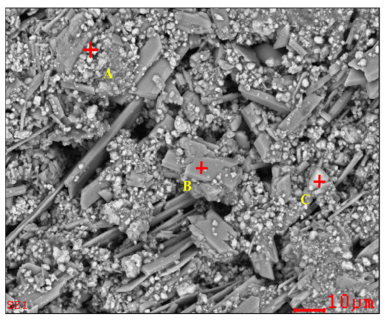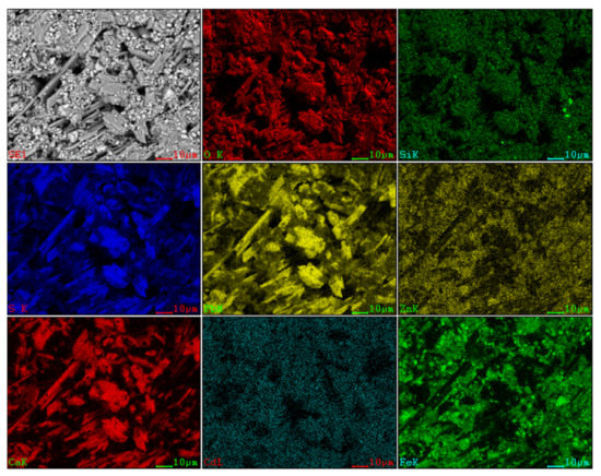 The SEM pattern indicates that ore particles in zinc oxide dust are compact with lots of amorphous flocculent inclusions embedded among the particles. The point and surface analysis results of SEM-EDS (see Figure 2 and Figure 3) show that in zinc oxide dust, most of the zinc is distributed in tiny floccule particles as floccules coexisting with O, Fe, Si, and Zn and lumps coexisting with O, S, Pb, and Ca. The zinc oxide dust was different from the original ore in mineral morphology, material existence form, and mineral surface property. The granular minerals were fused at a high temperature with zinc easy to be enveloped by other valuable metals and gangue components.