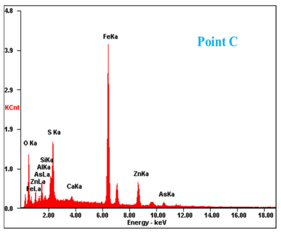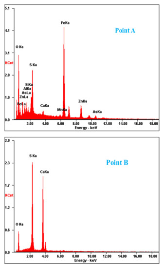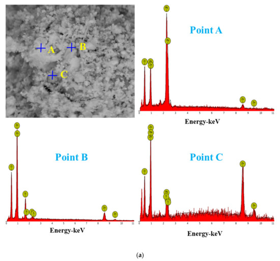 For the raw material, the conventional leached residue and ultrasonic leached residue underwent SEM morphology characterization, for which the results are shown in Figure 15. Figure 15 shows that the zinc oxide dust particles were under a state of aggregation, and under the conventional leaching conditions, the wrapped particles had no change in morphology with a corrosion phenomenon on their surfaces. However, under the ultrasound enhancement, the leached residue had particles dispersed evenly, and the wrapped particles and the wraps were opened. This is also an important reason why the zinc leaching rate under ultrasound is higher than that under conventional leaching conditions. An analysis of leached residue by EDS spot scanning was carried out, and the results were as shown in Figure 15 and Figure 16. The leached residue was complicated in composition, with the coexistence of Zn, Pb, Fe, O, S, and Si.